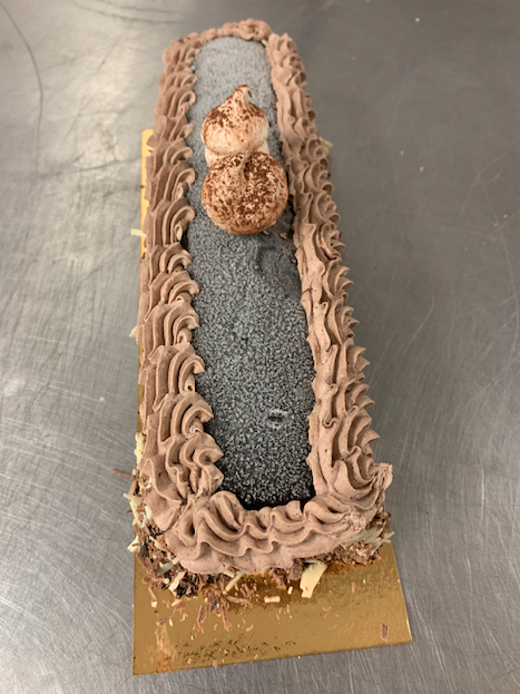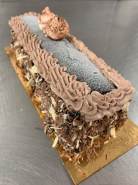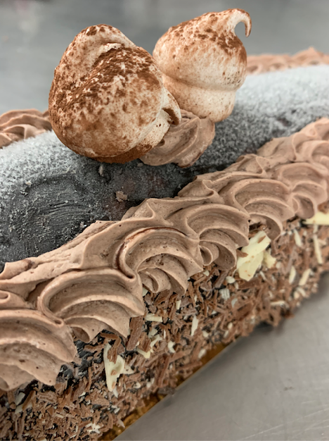 En forme de bûche, biscuit génoise et praliné noisette, crème glacée Chocolat noir, insert crème glacée Vanille Bourbon de Madagascar. Finition chocolat noir de couverture 70 % de cacao et noisettes pralinées, Crète de Meringue Italienne à la Norvégienne avec une nuance de poudre de Cacao.