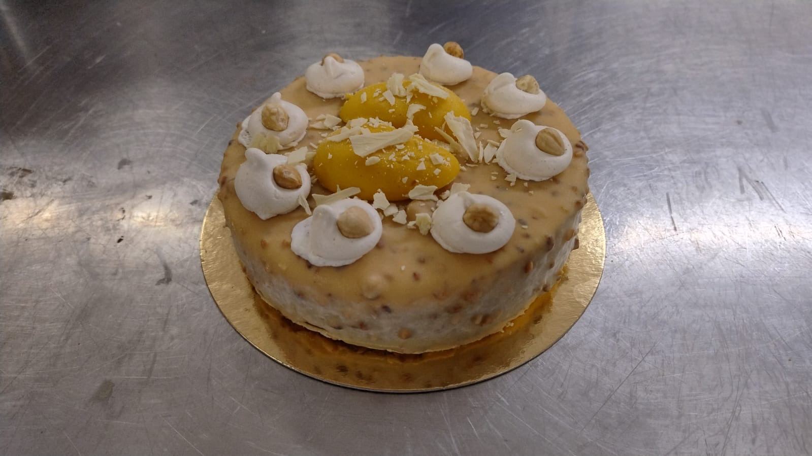 Crème glacée « Chocolat & Cacao », sorbet plein fruit « Passion », glaçage « Chocolat Blanc et Praliné Noisette » sur biscuit Madeleine.
